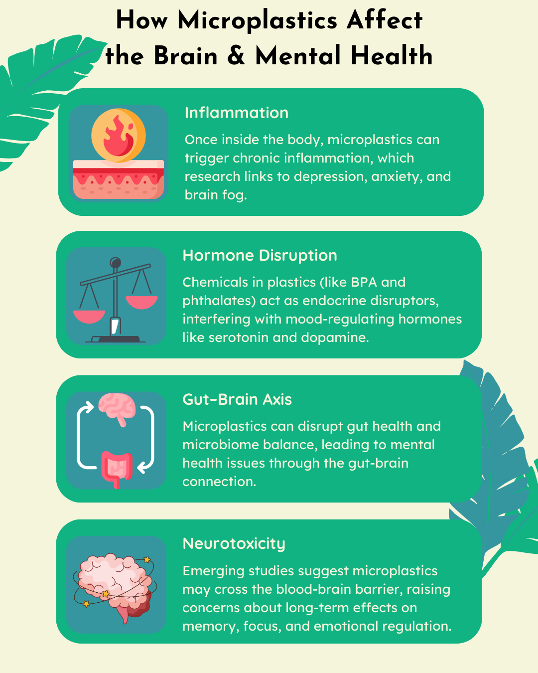 Potential Neurotoxicity: Early research suggests microplastics may cross the blood-brain barrier, raising concerns about long-term impacts on memory, focus, and emotional regulation.